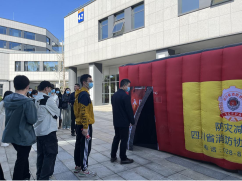 活动现场搭建了“逃生帐篷”,用以模拟火灾发生时的密闭环境,在场师生依次进行了实战演练,圆满完成了应急逃生演练任务。